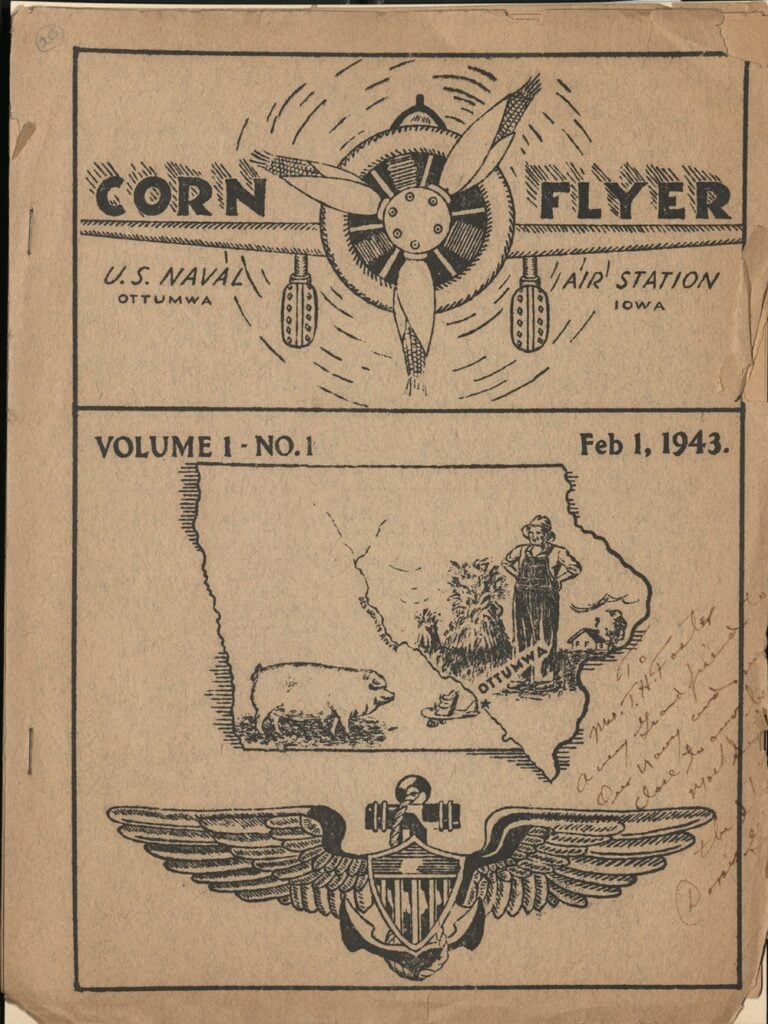 Corn Flyer was a publication of the U.S Naval Air Station in Ottumwa, Iowa, which served as a pilot training base during World War II. Future President Richard M. Nixon was stationed there for nine months, before being shipped out to the South Pacific in May of 1943. Over 4,600 cadets completed flight school at the station, surrounded by Iowa corn fields. (x-Collection VG94.5.O66 C6)