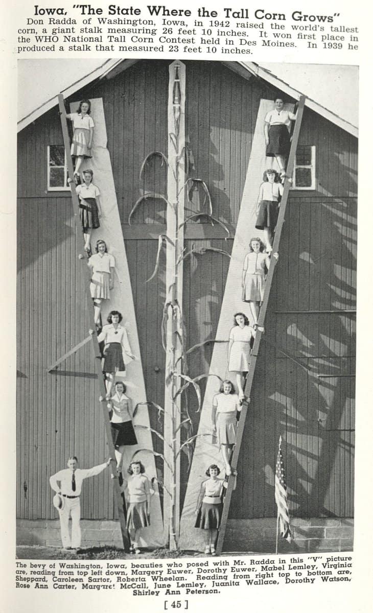 In this Iowa tourism pamphlet from 1945, potential visitors can marvel at the tallest corn stalk in Iowa recorded at that time. (x-Collection F619.3.S73 1945)