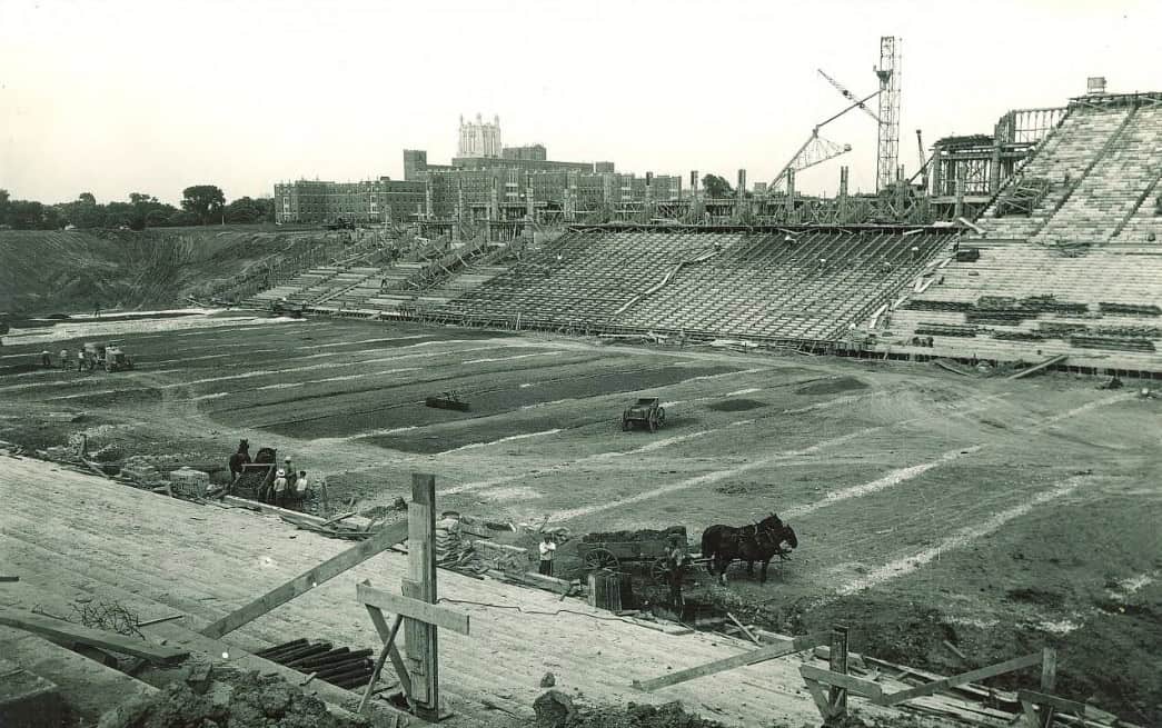 A century ago, the athletics department wanted a new field, but building a new, larger venue was not an easy task. The stadium was constructed over a period of about seven months during 1929, totaling $484,798, or over $9 million today. Being built a century ago in a rural state, horses and mules (as seen below) were used to excavate and pull heavy equipment, and workers toiled day and night until completion in October 1929.