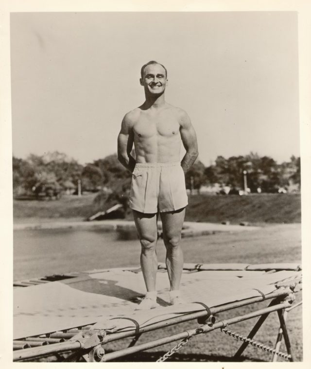 Nissen brought his athletic and academic skills to Iowa City and the University of Iowa. He graduated in 1937 a bachelor’s degree in business administration. During his time at school, he was an active member of the Pi Kappa Alpha fraternity, a three-time NCAA gymnastics champion, and participated in the annual Dolphin Shows – aquatic showcases that featured divers and acrobatics. Upon graduation, Nissen and two of his friends joined forces as a traveling acrobatic group, utilizing Nissen’s trampoline as part of their act. The Three Leonardos, as they were known, ended their touring when Nissen joined the Navy to fight in World War II.