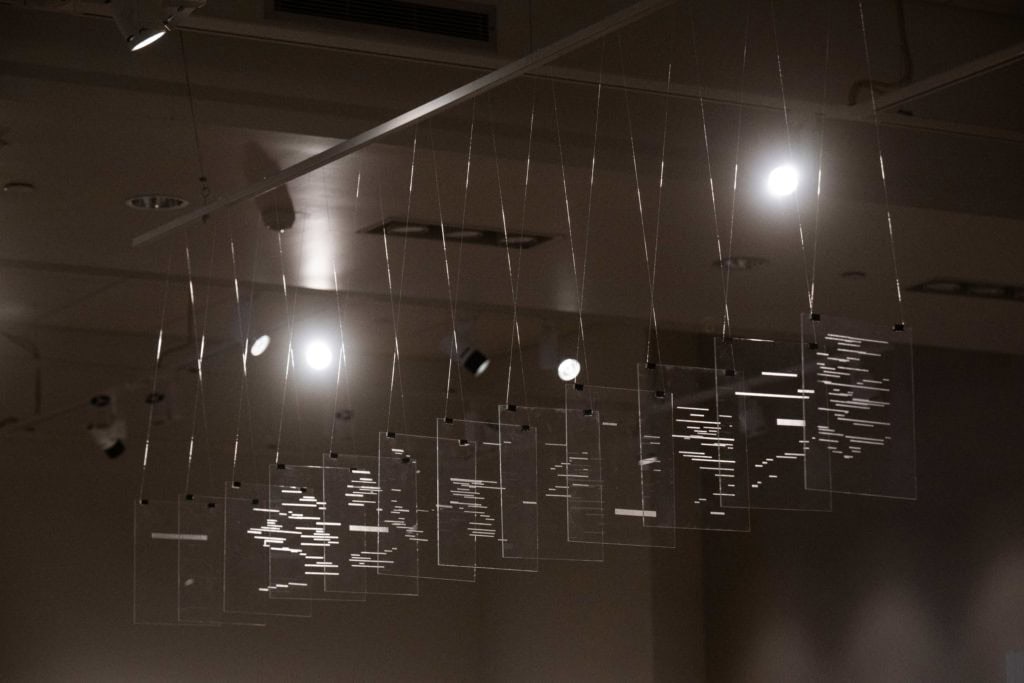 Mallarmé was one of the first poets to suggest that words on a page contain information beyond the ideas the words represent. How the words looked on the page also brought meaning. Indeed, many artists have taken inspiration from “Un coup de dés” by changing the visual aspects of the poem in some ways by altering not only the text but the physical material of the poem, like the interpretation below from Michalis Pichler, etched onto plexiglass panels. The clear medium calls extra attention to the negative space between the words and invites the viewer to meditate on the relationship between the words and the page.