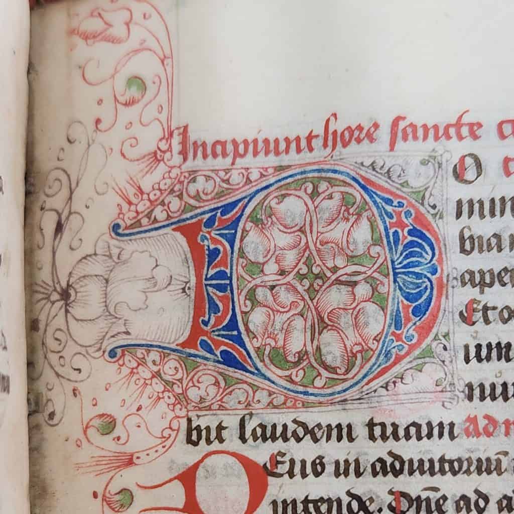 Within the actual book of hours, the simplest versals look pretty similar to those in the book’s fly leaves. The main difference is the use of color; the scribes used vibrant red and blue pigments to fill in any gaps in the letters. They’re also very small. They fit right in with the rest of the lines of text; they’re just a bit wider than the normal calligraphed letters.