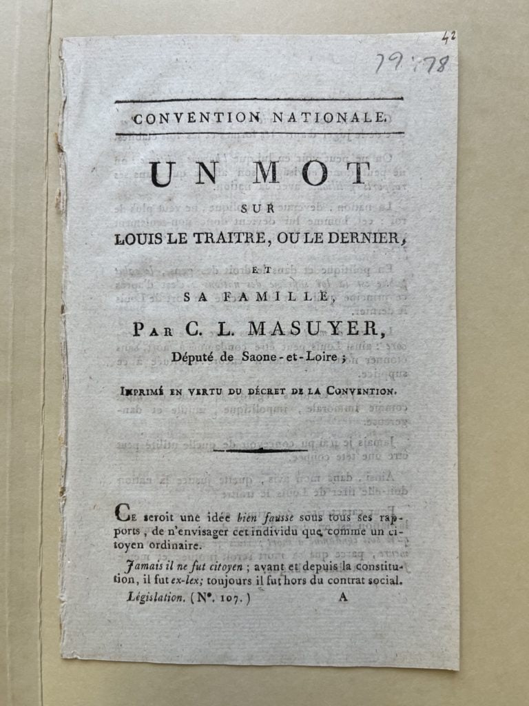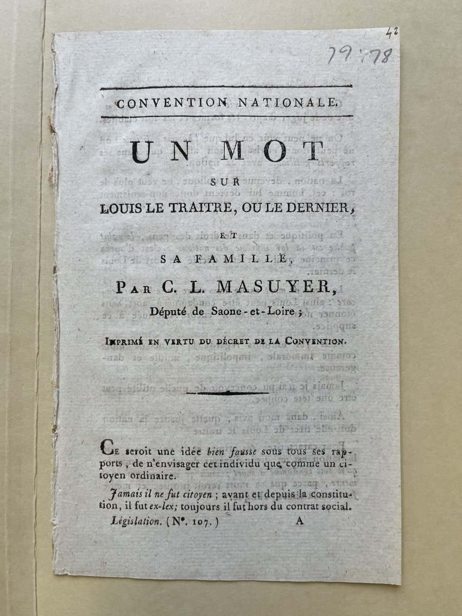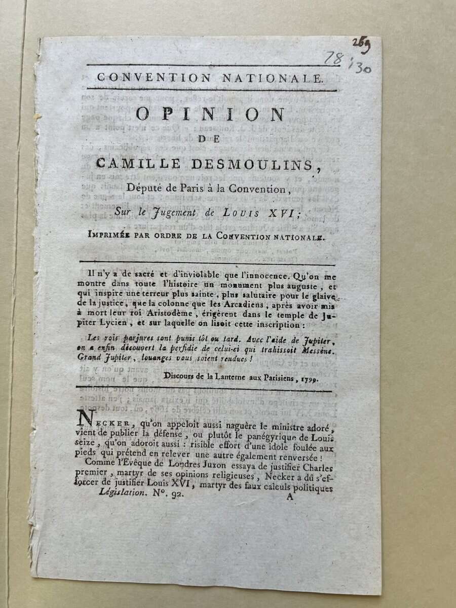 (Box 77:66-78:80, item 78:30), “Convention nationale. opinion de camille desmoulins, Député de Paris à la Convention, Sur le Jugement de Louis XVI; Imprimée par ordre de la Convention nationale. Il n’y a de sacré et d’inviolable que l’innocence. Qu’on me montre dans toute l’histoire un monument plus auguste, et qui inspire une terreur plus sainte, plus salutaire pour le glaive de la justice, que la colonne que les Arcadiens, après avoir mis à mort leur roi Aristodème, érigèrent dans le temple de Jupiter Lycien, et sur laquelle on lisoit cette inscription: Les rois parjures sont punis tôt ou tard. Avec l’aide de Jupiter, on a enfin découvert la perfidie de celui-ci qui trahissoit Messène. Grand Jupiter, louanges vous soient rendues! Discours de la Lanterne aux Parisiens, 1790.” (This pamphlet is not from 1790, Camille is quoting a speech he made previously in the title.)
