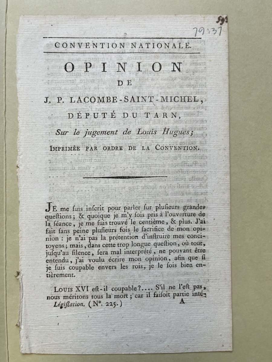 You can find a pamphlet that uses this name in the image above and in Special Collections: (box 79:1-80:10, item 79:37), “Convention nationale. opinion de j. p. lacombe-saint-michel, député du tarn, Sur le jugement de Louis Hugues; Imprimée par ordre de la Convention.”