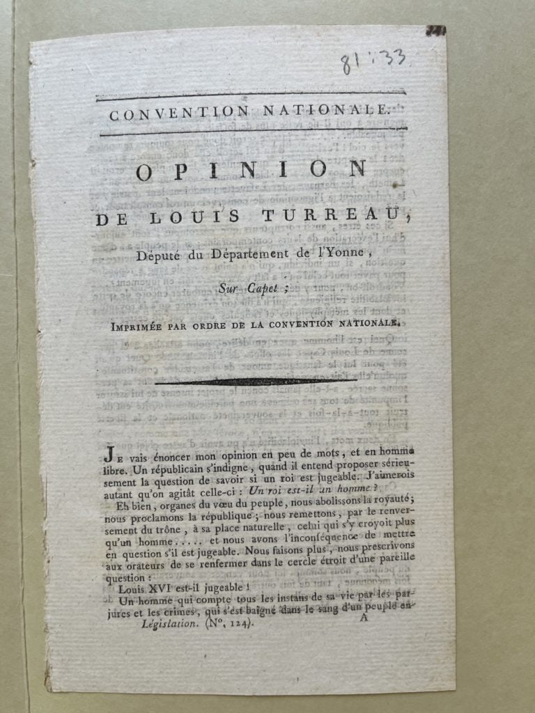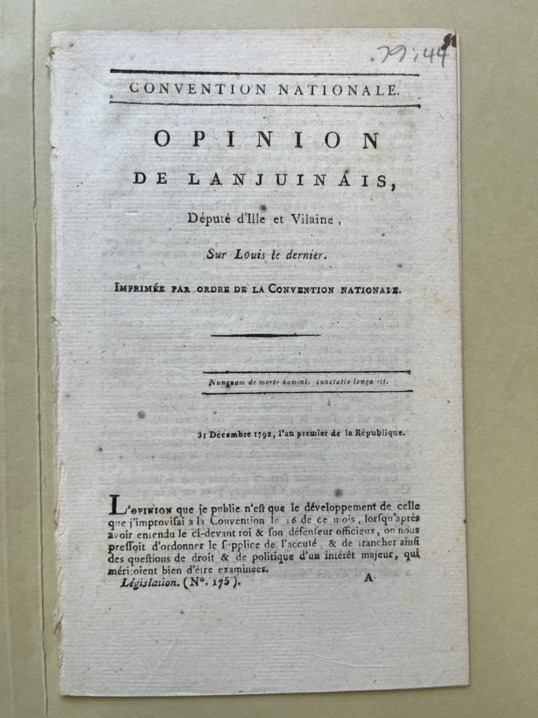 You can find this name on the above pamphlet: (box 79:1-80:10 item 79:44), “Convention nationale. opinion de lanjuinais, Député d’Ille et Vilaine, Sur Louis le dernier. Imprimée par ordre de la Convention nationale. Nunquam de morte hominis cunctatio longa est. 31 Décembre 1792, l’an premier de la République.”