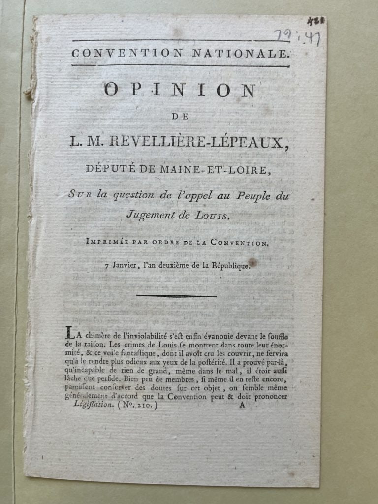 You can find a pamphlet that uses this name in the image above and in Special Collections: (box 79:1-80:10, item 79:47), “Convention nationale. opinion de l. m. revellière-lépeaux, député de maine-et-loire, Sur la question de l’appel au Peuple du Jugement de Louis. Imprimée par ordre de la Convention. 7 Janvier, l’an deuxième de la République.”