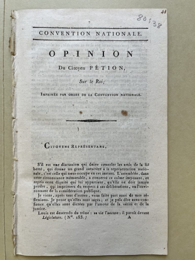Find this pamphlet that uses the name in the image above and in Special Collections: (box 80:11-81:13, item 80:38), “Convention nationale. opinion Du Citoyen pétion, Sur le Roi; Imprimée par ordre de la Convention nationale.”